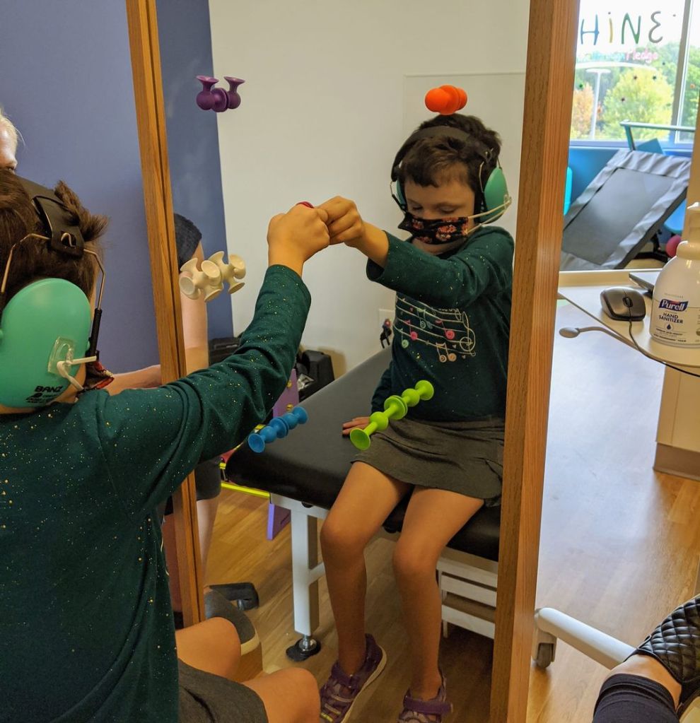 Getting Libby back into physical and occupational therapy has been SUCH a breath of fresh air. Before March, I knew what a blessing it was, but I took it for granted. I lived for the days we did NOT have to drive to therapy, and now we live for the days we do (and a longer drive, at that). Crazy what 6 months of abrupt, cold turkey, “no schedule no plans” will make you grateful for. I’m thriving on the schedule. Libby’s thriving on the engagement and the new ideas of her therapy team. Especially while school is still nowhere close to the real deal for her – therapy days are the best days.